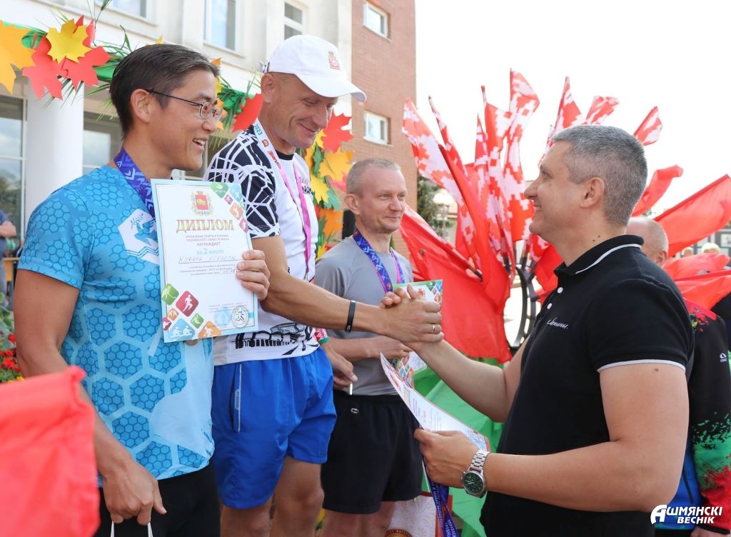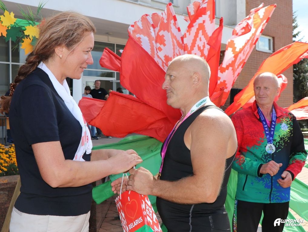 Заместитель председателя районной организации РОО «Белая Русь» Светлана Барковская за волю к победе вручила подарки Анатолию Шидловскому (ОАО «Ошмянский мясокомбинат») и Владимиру Ярошевичу (ОАО «Радиотехника»). Самая юная участница на дистанции в 5 км Мария Масевич из Кольчунской СШ принимала поздравления от районной организации «Белорусский союз женщин» в лице начальника отдела идеологической работы и по делам молодежи Ольги Шидловской.