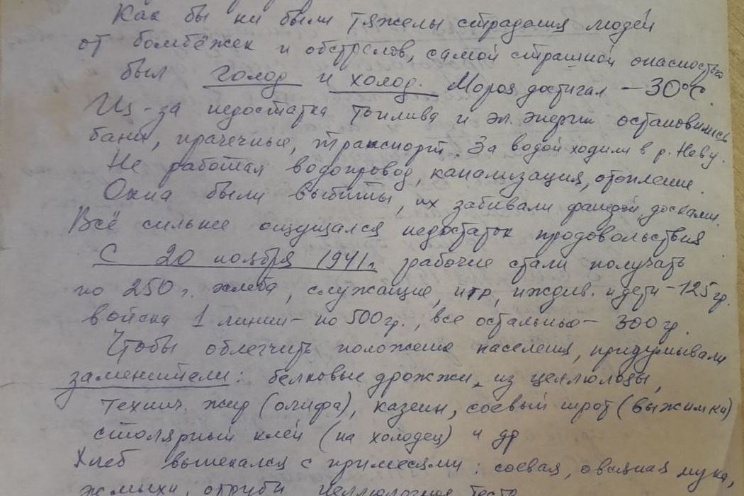 В воспоминаниях поразили строки о том, что ленинградцы, несмотря на свое бедственное положение, оказывали помощь фронтовикам. «Рабочие и жители Ленинграда оказывали моральную поддержку фронтовикам: писали письма, передавали подарки, теплые вещи, помогали тушить пожары, разбирали завалы, извлекали из-под обломков зданий заживо погребенных людей. В свободное от работы время (дежурство в эвакогоспитале) я в числе сандружинниц участвовала в этом мероприятии.